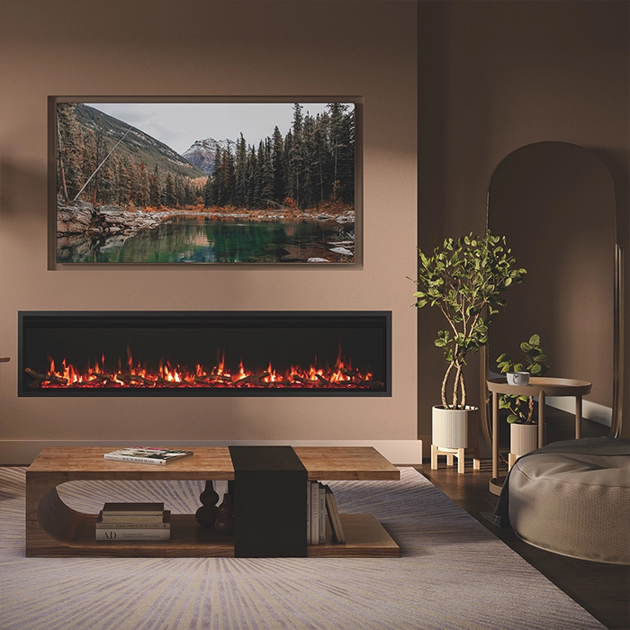 The Atmos electric fire features realistic faux logs set on a bed of blackened glass media, recreating the appearance of a real log fire. To enhance the effect, sections of the logs glow alongside the flame and fuel bed, creating a warm and authentic visual. The integrated lighting system also illuminates the ember bed from below, bringing the logs and embers to life and adding depth to the display.
